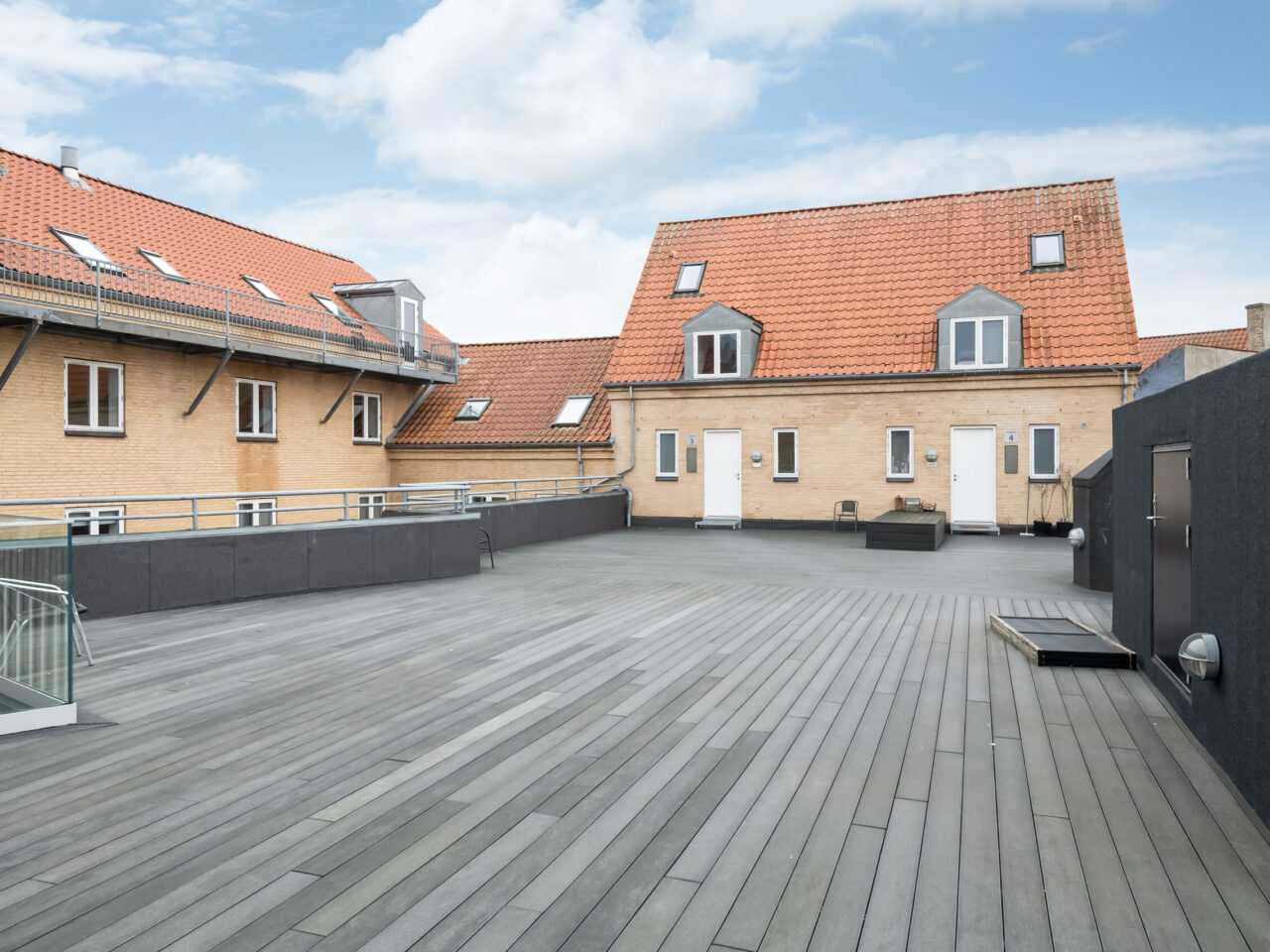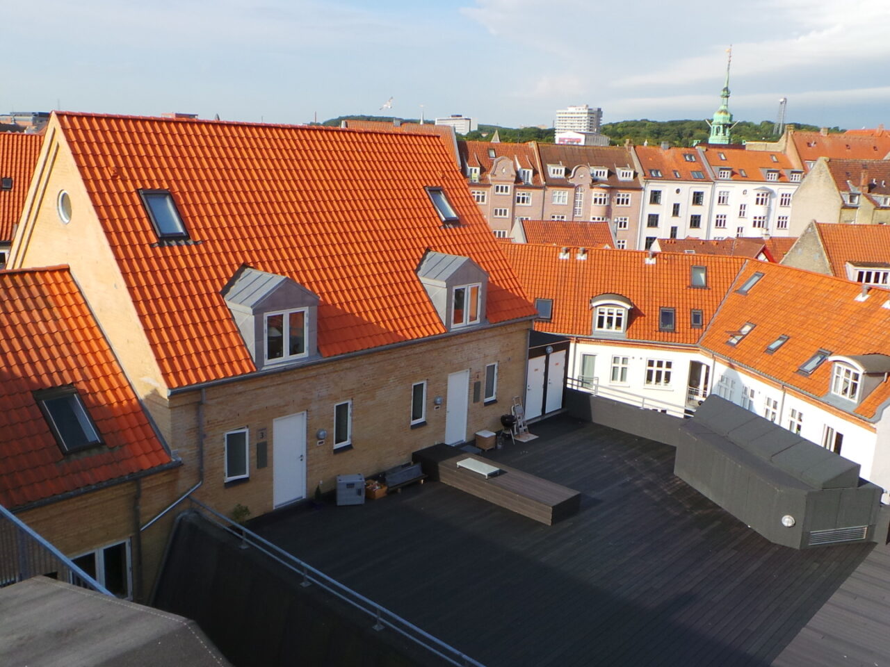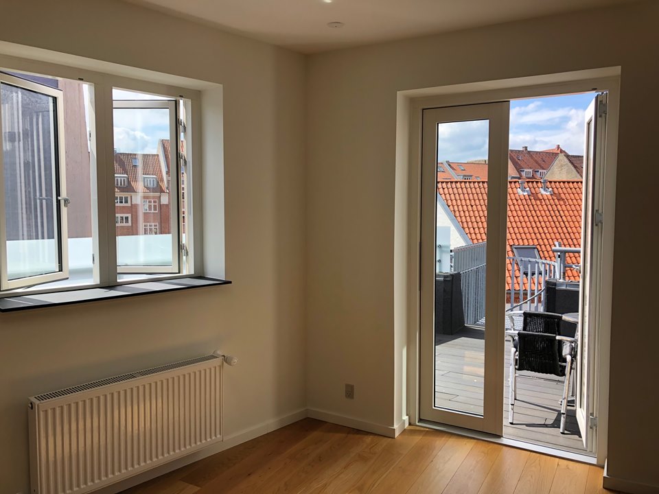 Bemærk den store fælles tagterrasse hvor det er muligt, at nyde de skønne sommeraftener, samt den hyggelige private terrasse som vender mod syd og er tilhørende lejligheden.