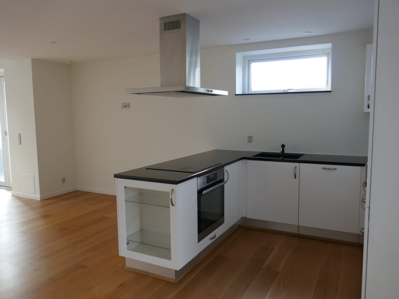 Fra lejlighedens entre er der adgang til lejlighedens køkken/alrum. Køkkenet indeholder sort granit bordplade, keramisk kogeplade, emhætte, integreret opvaskemaskine samt ovn, køle/fryseskab samt hvide køkkenelementer. Fra lejlighedens stue er der adgang til den private terrasse.
